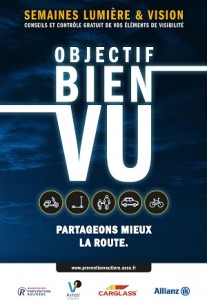 … à tenir tout particulièrement à la mauvaise saison, lorsque les nuits rallongent, les premiers brouillards annoncent d’autres intempéries et les conditions de visibilité se réduisent. La campagne annuelle de l’association Prévention Routière se termine, mais son slogan « Objectif bien vu » demeure d’actualité au moins pendant tout l’hiver… que l’on soit piéton, cycliste,...…